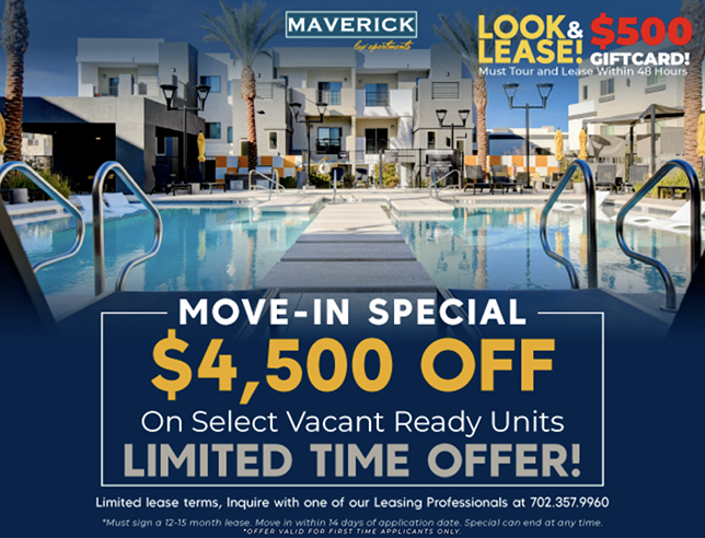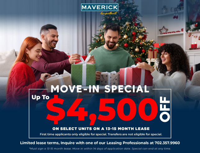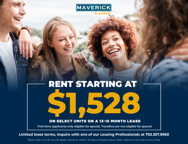 At Maverick, you’ll get all the convenience of the neighborhood as well as the thrill and excitement of the downtown area. Our luxury apartments near the Las Vegas strip are minutes from shopping, dining, and major employers, as well as Vegas hot spots such as Allegiant Stadium, MGM Grand, and T Mobile Arena.